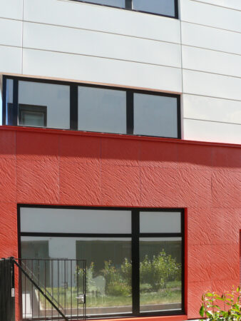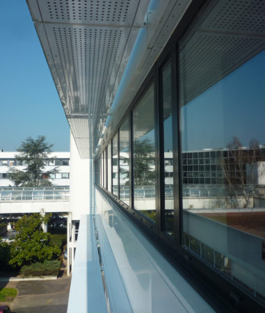 Profil environnemental : Certification label THPE (Très Haute Performance Énergétique, RT 2005 -20%) – Profilés aluminium à rupture de pont thermique, et confort acoustique 30 dB, 4/16/4 avec contrôle solaire et vide argon – Brise-soleil horizontaux lames aluminium sur structure aluminium – Cloisons acoustiques plaques de plâtre multiples avec double isolant, Rw 70dB – VMC double flux avec récupération de chaleur.