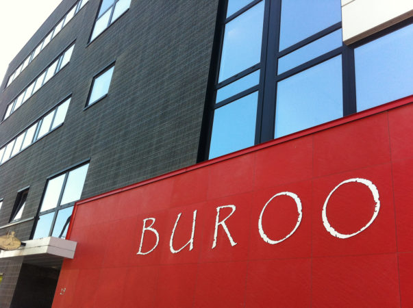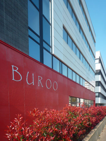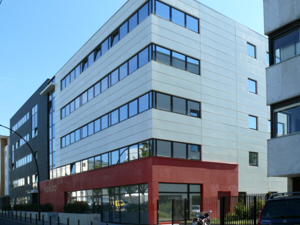 La construction s’inscrit dans le gabarit de 16m de hauteur et respecte un retrait de 8m par rapport au bâtiment existant mitoyen rue Romain Rolland. La toiture terrasse du sous-sol est partiellement en saillie par rapport au terrain naturel. Il est traité à la manière d’un jardin japonais clos d’une grille identique à celle du voisin, récupérée sur le site. Le retrait sur la rue devient un élargissement du trottoir existant, permettant de gérer, par un jeu de pentes, d’emmarchements et de jardinières, le dénivelé du terrain naturel (090 m environ sur la longueur du bâtiment B) et de rendre accessible l’ensemble des bureaux du rez-de-chaussée aux PMR.