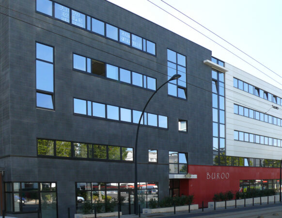 Le bâtiment comprend 4 niveaux de bureaux et un niveau de sous-sol. Les bureaux sont livrés en plateaux à aménager pour une SHON de 2528 m². Le pignon nord-ouest est conçu dans la continuité du bâtiment existant : architecture de fenêtres en bandeaux filants et allèges pleines bardées d’aluminium blanc. Le reste de la façade, recouvert d’un bardage minéral noir, s’inscrit en rupture d’échelle. La teinte rouge du béton lasuré en rez-de-chaussée rappelle la modénature des commerces de la place Bellevue.
